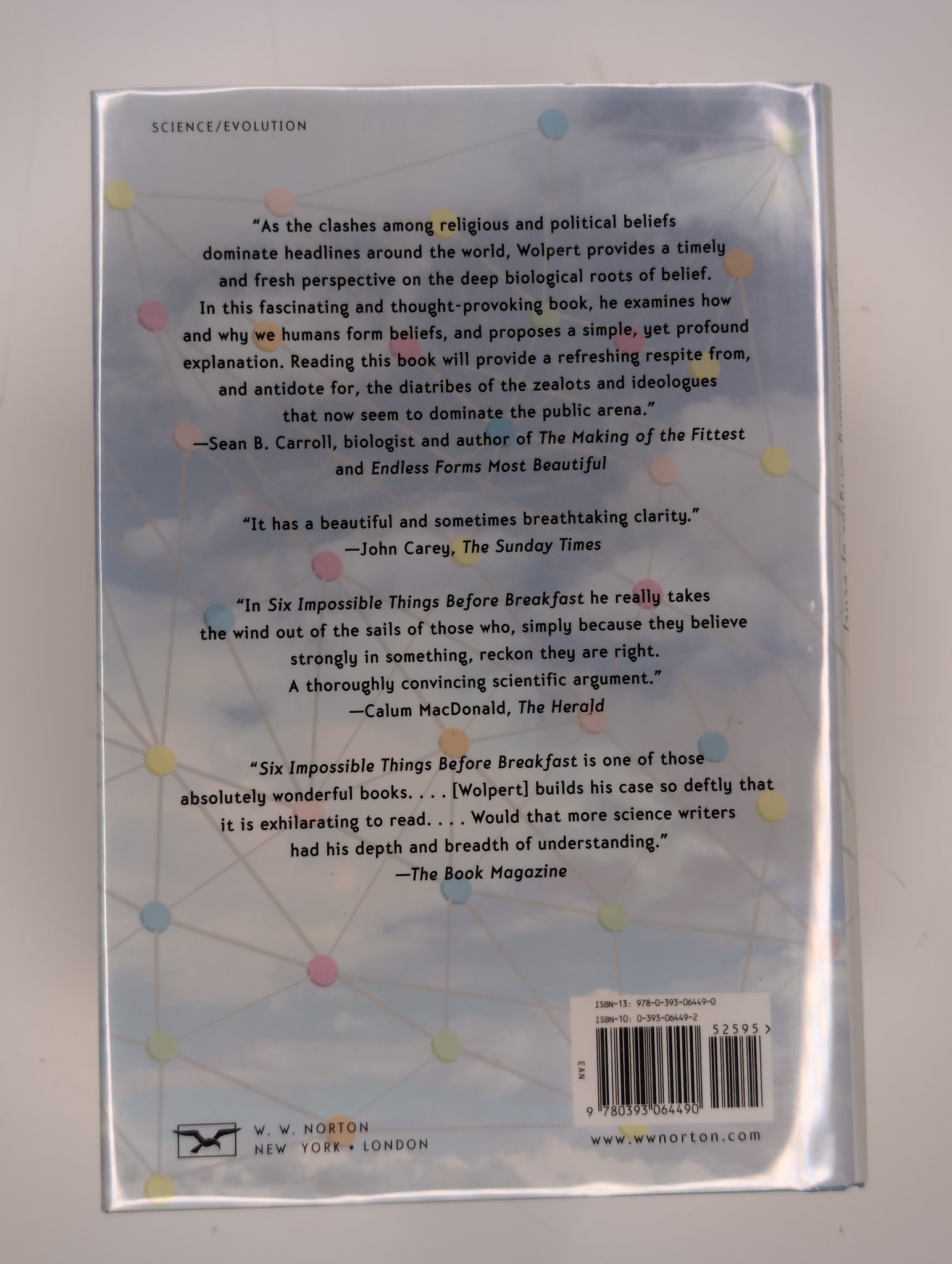 Lewis Wolpert examines the evolutionary roots of human belief and why we are wired to seek cause-and-effect explanations for everything. He argues that our capacity for belief, whether scientific or religious, is a fundamental byproduct of how the human brain evolved. This book is sold by Underworld Amusements as "used" and should be considered in Good condition or better unless otherwise noted. Any condition issues below Good will be explicitly described. All items are sold as-is, and photographs show the exact copy being purchased. Brief descriptions are provided where relevant; for additional details about a title or edition, please consult independent online references.
