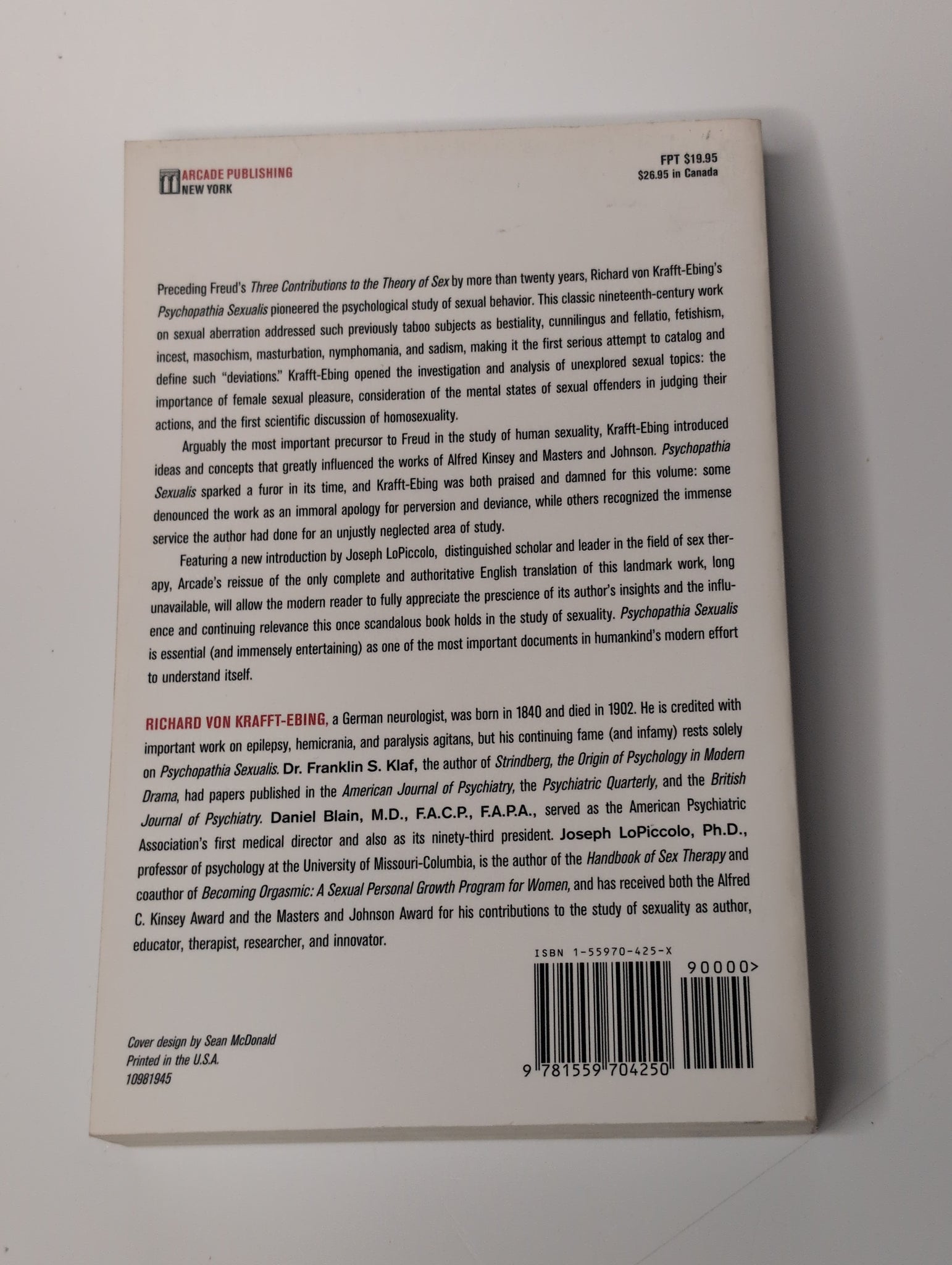 A landmark 19th-century medical text, this work was one of the first to systematically study and categorize various human sexual behaviors. Though historical in its approach, it remains a foundational document in the history of forensic psychology and sexology. This book is sold by Underworld Amusements as "used" and should be considered in Good condition or better unless otherwise noted. Any condition issues below Good will be explicitly described. All items are sold as-is, and photographs show the exact copy being purchased. Brief descriptions are provided where relevant; for additional details about a title or edition, please consult independent online references.